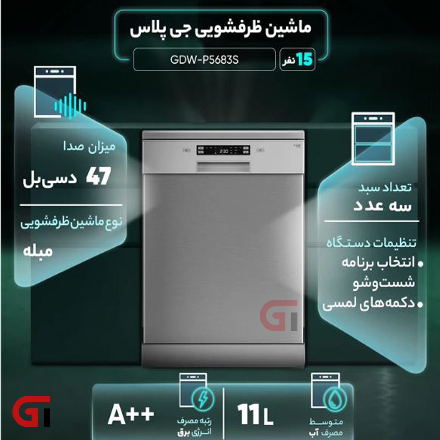 طراحی و ظرفیت ماشین ظرفشویی ۱۵ نفره جی پلاس مدل GDW-P5683S