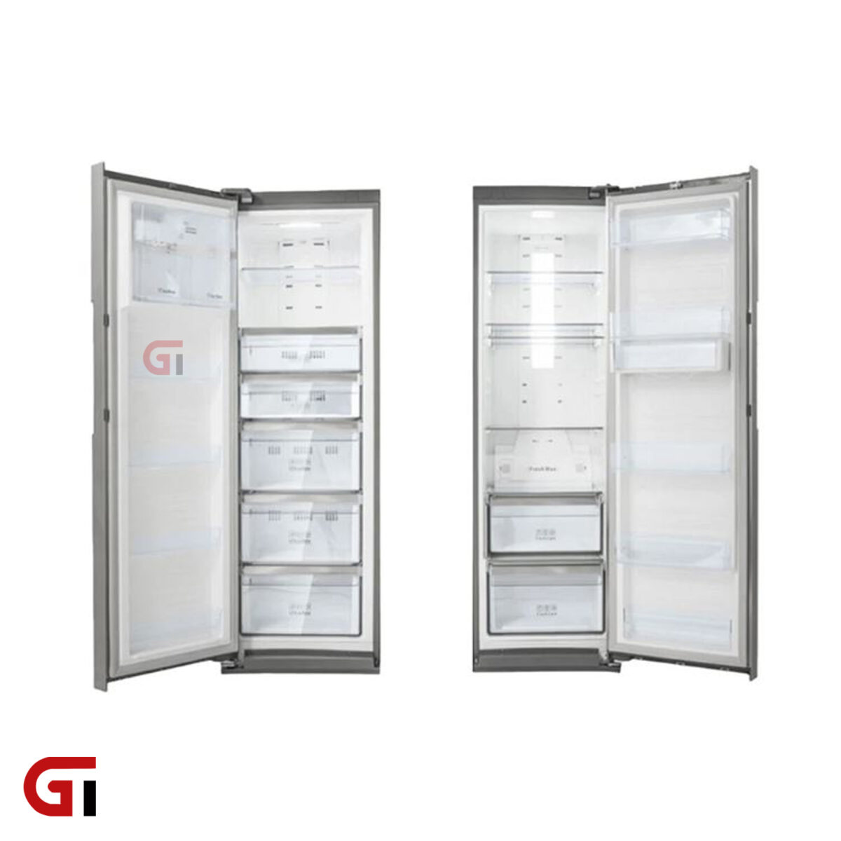 حضور قدرتمند و متقارن دو واحد مجزای یخچال و فریزر SRI/SFI-20SS، در همان نگاه اول، حس وسعت، نظم و تکنولوژی پیشرفته را القا میکند. طراحی این مجموعه با دقت و ظرافتی مثالزدنی انجام شده است. “نمایشگر بلند آینهای لمسی” که به زیبایی بر روی درب یکی از واحدها قرار گرفته، نه تنها جلوهای از مدرنیته و زیبایی را به آشپزخانه شما میافزاید، بلکه به عنوان رابط کاربری اصلی و مرکز کنترل هوشمند دستگاه عمل میکند. از طریق این نمایشگر، کاربران میتوانند به راحتی به تنظیمات دما، حالتهای عملکرد و سایر قابلیتهای هوشمند دسترسی پیدا کنند. طبقات شیشهای بدون قاب در فضای داخلی، علاوه بر ایجاد ظاهری تمیز و وسیع، به دید بهتر و تمیزکاری آسانتر کمک میکنند. با ارتفاع ۱۸۰ سانتیمتر، عرض کلی ۱۲۰ سانتیمتر و عمق ۶۶ سانتیمتر، این مجموعه حضوری چشمگیر و در عین حال متناسب با آشپزخانههای جادار امروزی دارد. با مجموع گنجایش ۶۷۳ لیتر، این مجموعهی دوقلو فضای ذخیرهسازی بینظیری را ارائه میدهد. بخش یخچال با ظرفیت سخاوتمندانهی ۳۶۱ لیتر، شامل ۵ طبقهی شیشهای مقاوم و ۶ قفسهی جادار روی درب است که امکان نگهداری منظم انواع بطریها، ظروف و مواد غذایی کوچک و بزرگ را فراهم میکند. دو کشوی بزرگ هم برای نگهداری بهینهی میوهها و سبزیجات با حفظ رطوبت و تازگی ایدهآل طراحی شدهاند.